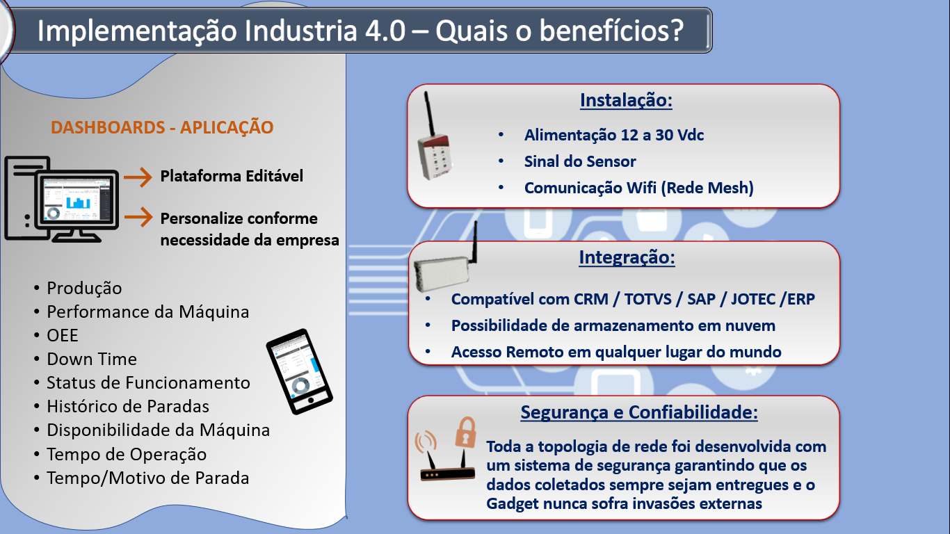 Um produto de alta tecnologia com baixo investimento e personalizável de acordo com a necessidade do cliente. Sua proposta parte dos princípios da indústria 4.0, onde através de sensores o dispositivo realiza a amostragem dos dados de produção, e através do seu sistema de processamento são gerados diversos dados analíticos como: